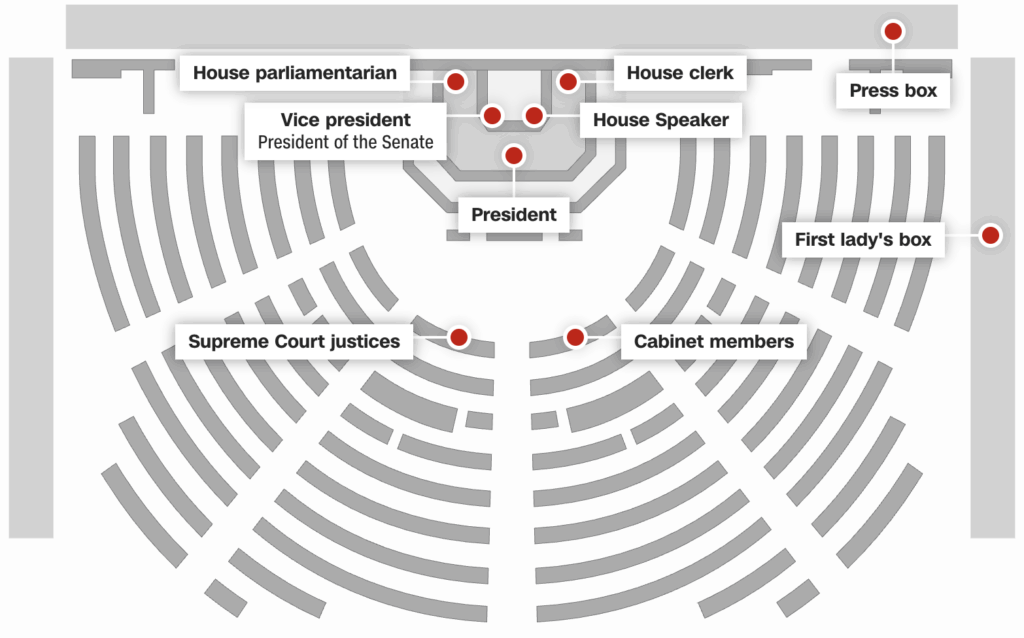 - Members of Congress: Senators and Representatives fill the remaining seats on the floor. These are not assigned and are generally taken on a first-come, first-served basis.